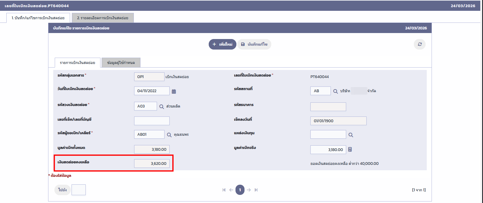 หน้าจอบันทึกแก้ไขรายการเบิกเงินสดย่อย เพิ่มช่องสำหรับแสดงเงินสดย่อยคงเหลือ