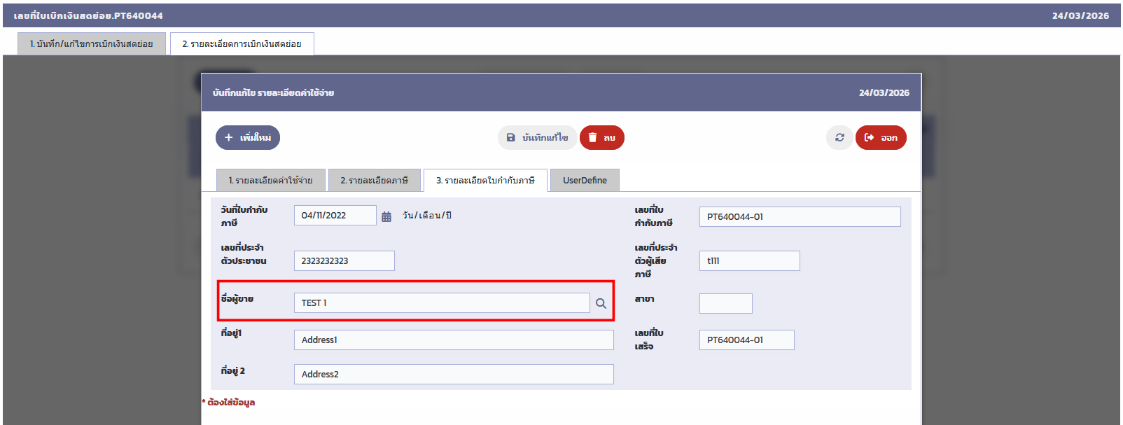 หน้าจอรายละเอียดการเบิกเงินสดย่อย Tab รายละเอียดใบกำกับภาษี เพิ่มการใช้ Lookup สำหรับเลือกข้อมูลชื่อผู้ขายได้