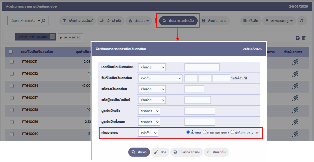 ปุ่มค้นหาตามเงื่อนไข เพิ่มให้สามารถเลือกเงื่อนไขกรองข้อมูลการผ่านรายการได้