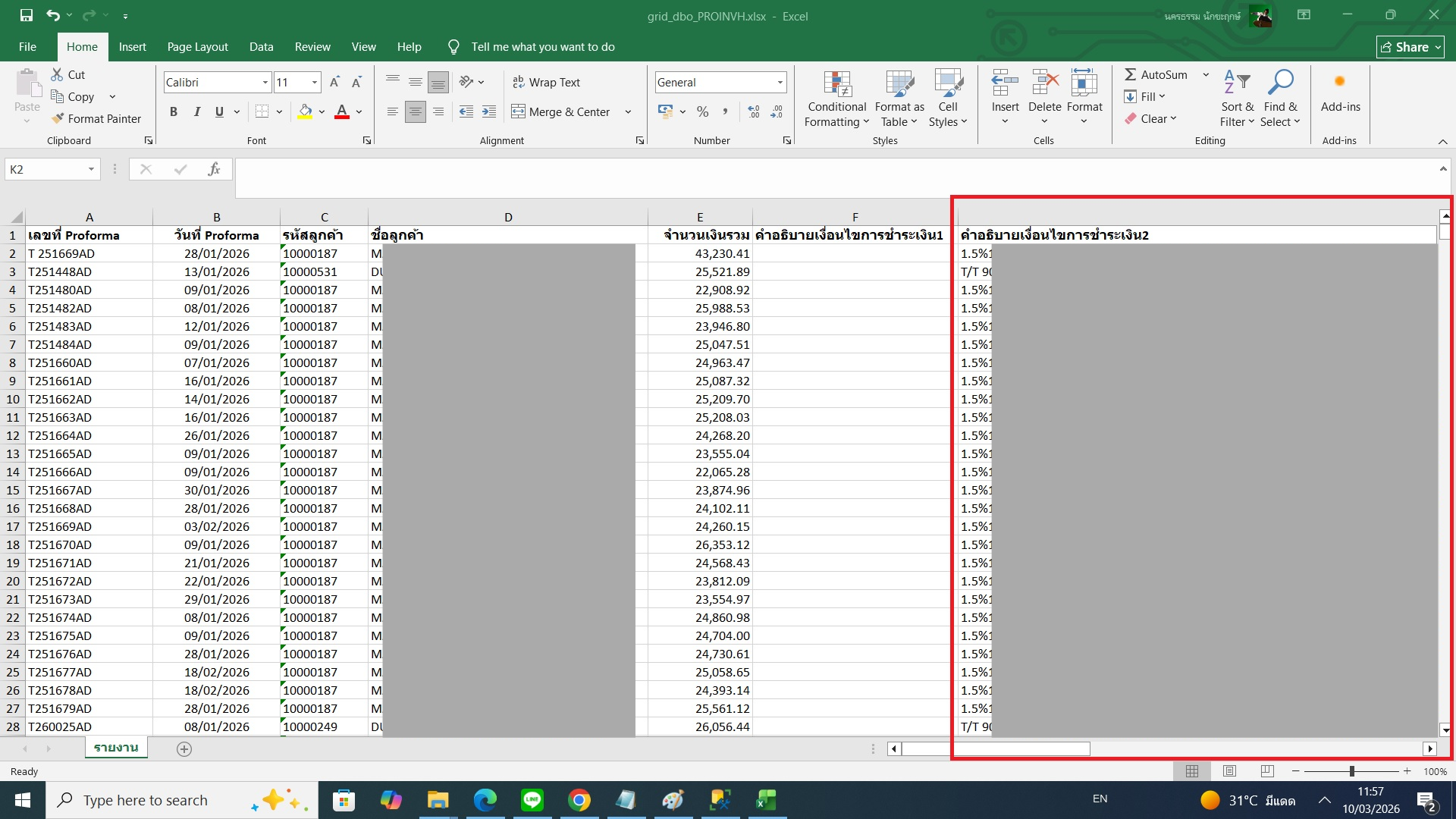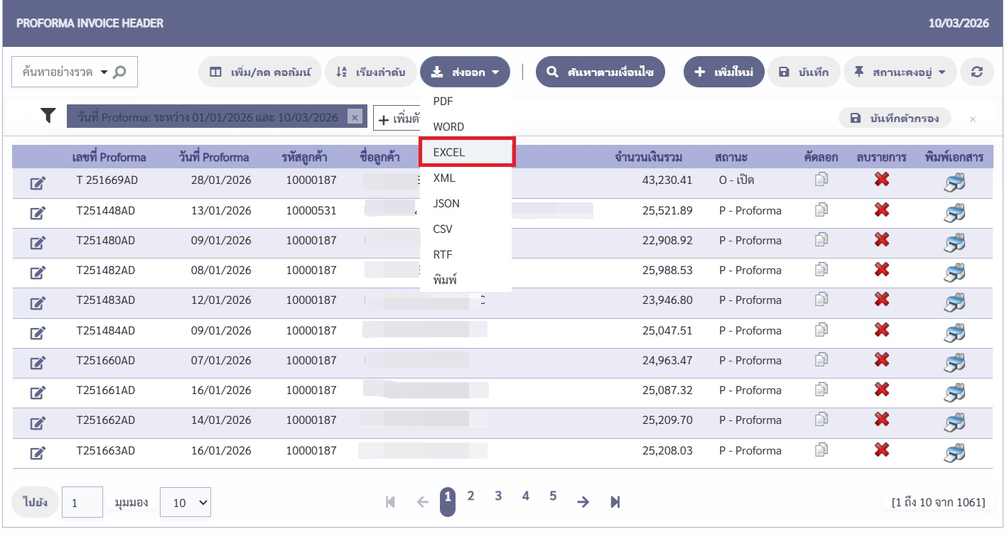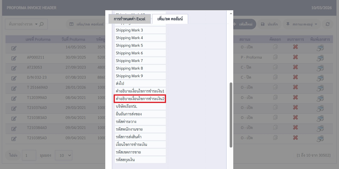 ระบบงานควบคุมเอกสารการขายต่างประเทศ : ปรับปรุงหน้าจอรายการ Proforma ปุ่มส่งออกไฟล์ EXCEL เพิ่มให้แสดงคอลัมภ์ “คำอธิบายเงื่อนไขการชำระเงิน2”